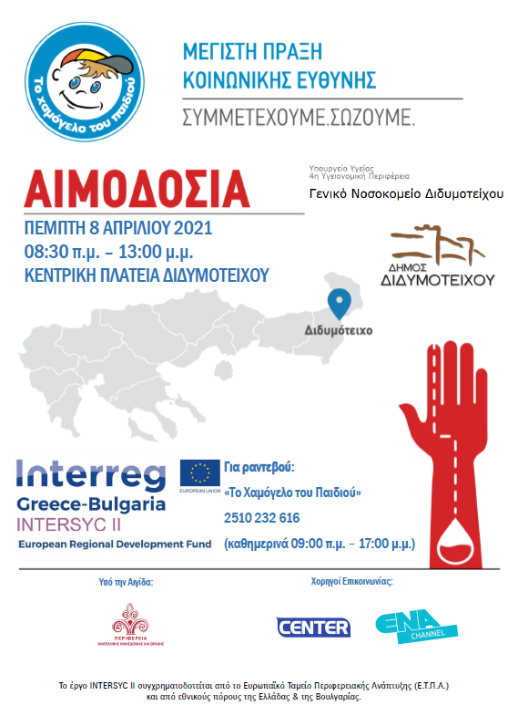 "The Smile of the Child", in the context of the implementation of the project "Integrated Territorial Synergies for Health and Protection of Children II (Integrated Territorial Synergies for Children Health and Protection II) - INTERSYC II", carries out voluntary blood donation in Didymoteicho on Thursday, April 8 2021 from 08:30 a.m. to 13:00 pm, strengthening the National Health System and contributing substantially to tackling the Covid-19 pandemic. The voluntary blood donation action is carried out under the auspices of the Region of Eastern Macedonia - Thrace and in collaboration with the Municipality of Didymoteicho and the General Hospital of Didymoteicho.